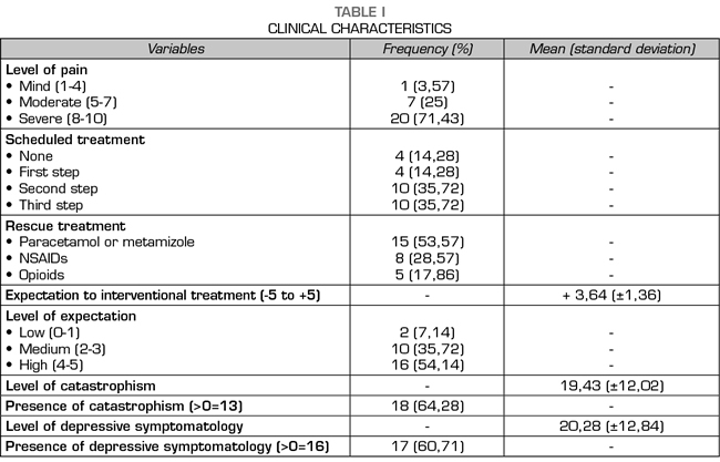 The identification of psychological factors predictive of response to treatment in patients with chronic low back pain is of utmost importance. As they are potentially modifiable, their assessment is recommended at the beginning of the therapeutic approach of the patient with pain (16-18). In our series, the prevalence of low level and medium level of expectation to interventional treatment was 7.14% and 35.72%, respectively; whereas 64.28% of patients presented catastrophism and 60.71% of patients presented depressive symptoms.