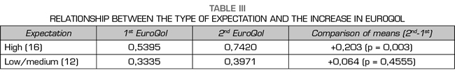 The patients with high expectation had a significant decrease in the VAS of -1.94 (p = 0.0003) and a rise of the EuroQol of +0.203 (p = 0.003), while in the medium/low expectation group this decrease in VAS was nonsignificant (p = 0.9) nor was the increase in EuroQol (p = 0.455) (Tables II and III). A high expectation was a predictive factor for improvement for both the decrease in VAS (OR 13, 95% CI 2.12-79.59, p = 0.0061) and the reduction in rescue analgesia (OR 89.57, 95% CI 4.16-1927.37, p = 0.0001).