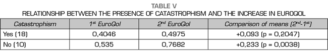 Patients with catastrophism (score ≥ 13 points) did not show a significant decrease in the mean of the VAS (p = 0.464) or a rise in the EuroQol (p = 0.204), whereas in the group of patients without catastrophism the decrease in the VAS (p = 0.001) and the increase of the EuroQol (p=0.003) were significant (Tables IV and V). The absence of catastrophism was a predictive factor for improvement for the three variables studied: decrease in VAS (OR 32.2, 95% CI 1.63-635.5, p = 0.0016),