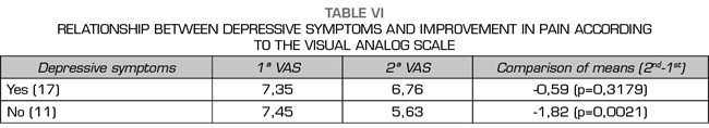 Patients with depressive symptomatology (score ≥ 16 points) did not present a significant decrease in the mean VAS (p = 0.317) or a rise in the EuroQol (p = 0.387), whereas in the group of patients without depressive symptomatology the decrease in VAS (p = 0.002) and the increase in EuroQol (p = 0.003) were significant (Tables VI and VII). In the analysis of association, the absence of depressive symptomatology was a significant predictor of improvement only for the reduction in scheduled analgesia (OR 51.86, 95% CI 2.3-1771.12, p = 0.001).