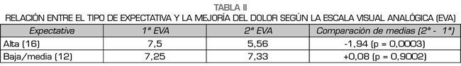 Los pacientes con expectativa alta tuvieron una disminución significativa de la EVA de -1,94, (p = 0,0003) y un ascenso del EuroQol de +0,203 (p = 0,003), mientras que en el grupo de expectativa media/baja esta disminución de la EVA no fue significativa (p = 0,9) ni tampoco el aumento del EuroQol (p = 0,455) (Tablas II y III). Una expectativa alta fue un factor predictivo de mejoría tanto para la disminución de la EVA (OR 13; IC95 % 2,12-79,59; p = 0,0061) como para la reducción de la analgesia de rescate (OR 89,57; IC95 % 4,16-1.927,37; p = 0,0001).