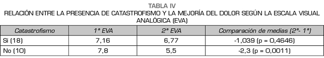 Los pacientes con catastrofismo (puntuación ≥ 13 puntos) no presentaron una disminución significativa de la media de la EVA (p = 0,464) ni un ascenso del EuroQol (p = 0,204), mientras que en el grupo de pacientes sin catastrofismo la disminución de la EVA (p = 0,001) y el aumento del EuroQol (p = 0,003) fueron significativos (Tablas IV y V). La ausencia de catastrofismo fue un factor predictivo de mejoría para las tres variables estudiadas: disminución de la EVA (OR 32,2; IC95 % 1,63-635,5; p = 0,0016), reducción de la analgesia pautada (OR 15,95; IC95 % 1,29-174,39; p = 0,0277) y reducción de la analgesia de rescate (OR 21; IC95 % 1,07-411,86; p = 0,009).