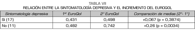 Los pacientes con sintomatología depresiva (puntuación ≥ 16 puntos) no presentaron una disminución significativa de la media de la EVA (p = 0,317) ni un ascenso del EuroQol (p = 0,387), mientras que en el grupo de pacientes sin sintomatología depresiva la disminución de la EVA (p = 0,002) y el aumento del EuroQol (p = 0,003) fueron significativos (Tablas VI y VII). En el análisis de asociación la ausencia de sintomatología depresiva solo fue un factor predictivo significativo de mejoría para la reducción de la analgesia pautada (OR 51,86; IC95 % 2,3-1771,12; p = 0,001).