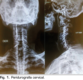 Pasa a recuperación donde hubo regresión completa del bloqueo cervical; el paciente se mantiene estable y con evolución favorable; fue evaluado por el servicio de terapia del dolor, donde se decide observar la permeabilidad del catéter, utilizando una sustancia de contraste iodado no iónico 3 cc, evidenciando en la imagen de “Peridurografía cervical” la difusión del contraste a ambos lados del espacio epidural (Figura 1), procediendo a continuar la analgesia en el postoperatorio a través del catéter epidural cervical con morfina 5 mg, bupivacaína 0,05 % y cloruro de sodio a 0,9 % 90 cc a través de bomba elastómerica a un flujo de 0,5 cc/hora durante 5 días. Se realizó el seguimiento durante la hospitalización, con controles en el postoperatorio inmediato y al primer día, teniendo un EVA 0/10, en estas dos evaluaciones, sin presentar ninguna complicación; fue dado de alta el 2.º día del postoperatorio con la infusión por bomba elastómerica, con un EVA 0/10, reevaluándose al 5.º día del postoperatorio por consultorio externo de terapia del dolor, presentando un EVA 0/10 y sin complicaciones desde el alta (Figura 2), procediendo al retiro del catéter epidural.
