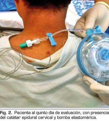En nuestro estudio se decidió optar por la anestesia epidural cervical, por la experiencia adquirida en tal procedimiento y por los múltiples beneficios que trae esta, descritos anteriormente, dentro de ellos el uso de catéter epidural para la analgesia postoperatoria, que, utilizando anestésicos locales y morfina, ambos en infusión continua con bomba elastomérica, permitieron el confort del paciente, presentando una escala visual análoga (EVA) de 0/10 en todas las evaluaciones postoperatorias y no requiriendo el uso de opioides como analgesia de rescate.