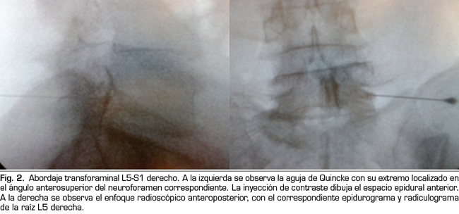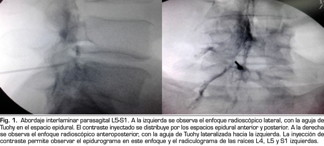 En 21 de los 26 procedimientos realizados por el acceso interlaminar parasagital se evaluó la calidad técnica de la inyección epidural de esteroides. En 15 (71 %) se obtuvo epidurograma anterior, esto es, alcance de la solución en la cara ventral del espacio (Figura 1 izda.); en 17 (85 %) el paciente refirió dolor o parestesias en el territorio radicular durante la inyección, y en 12 (60 %) se observó radiculograma junto a la imagen característica de epidurograma.