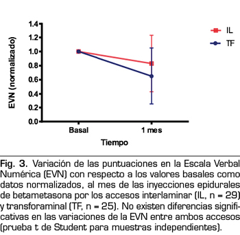 Un total de 64 pacientes con lumbociatalgia unilateral fueron incluidos en el estudio en el periodo de enero del 2016 a noviembre del 2017. De ellos, 29 fueron tratados con inyecciones epidurales de esteroides por vía interlaminar parasagital, mientras que 25 fueron tratados utilizando el abordaje transforaminal. Diez pacientes que recibieron el tratamiento no volvieron al control (3 por vía interlaminar parasagital, 7 por vía transforaminal). La edad promedio de los pacientes fue de 51 años. En cuanto al sexo, 32 pacientes eran de sexo femenino y 8 de sexo masculino. El tiempo promedio de evolución del dolor fue de 29 meses. La totalidad de los pacientes presentaron en la resonancia magnética protrusiones discales en los espacios L4/L5 y L5/S1, con grados variables de estenosis del canal. No se trataron pacientes con hernias discales. De los 54 pacientes, 29 fueron tratados con betametasona por la vía interlaminar parasagital y 25 por la vía transforaminal. La betametasona administrada por la vía interlaminar parasagital redujo la puntuación en la EVN un 20 %, de 7,7 ± 1,5 a 6,2 ± 3,1 (diferencia estadísticamente significativa, p = 0,03, prueba t de Student para muestras pareadas) y por la vía transforaminal un 36 %, de 8,3 ± 1,5 a 5,3 ± 3,3 (p = 0,0001). La Figura 3 muestra los valores de la EVN normalizados (esto es, expresados como porcentaje de cambio) de ambos grupos, basales y al mes del tratamiento. Si bien se puede observar que el porcentaje de cambio es mayor en los pacientes en los que se utilizó la vía transforaminal que en los que se utilizó el abordaje interlaminar, esta diferencia no es estadísticamente significativa (p = 0,13, prueba t de Student para muestras independientes).
