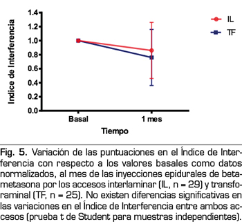 Los Índices de Intensidad e Interferencia también fueron reducidos por la inyección epidural de esteroides (Figuras 4 y 5). La betametasona administrada por la vía interlaminar parasagital redujo el Índice de Intensidad de 7,2 ± 1,2 a 5,8 ± 2,1 y el Índice de Interferencia de 7,0 ± 1,8 a 5,8 ± 2,5, en ambos casos una disminución estadísticamente significativa (p = 0,002 y p = 0,01, respectivamente; prueba t de Student para muestras pareadas). La betametasona administrada por la vía transforaminal redujo el Índice de Intensidad de 7,7 ± 1,6 a 5,7 ± 2,4 y el Índice de Interferencia de 7,7 ± 1,7 a 6,3 ± 3, reducción estadísticamente significativa (p = 0,0002 y p = 0,008, respectivamente). No hubo diferencias estadísticamente significativas entre ambos accesos al comparar la reducción de ambos índices.