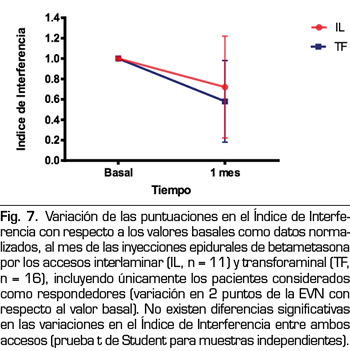 Cuando se compararon los cambios en la EVN y en el Índice de Interferencia de aquellos pacientes cuyas respuestas se consideraron satisfactorias utilizando betametasona por vía interlaminar o parasagital (11 y 16 respectivamente), no se observaron diferencias en ninguno de estos parámetros (Figuras 6 y 7).