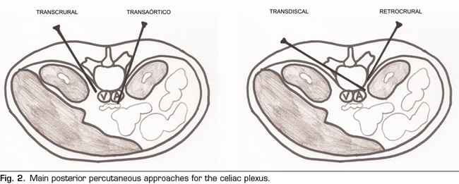 Transcrural approach: the most commonly used for the blockage of the celiac plexus (Figure 3). The patient is placed in prone position, identifying the vertebral body L1 and advancing a needle on each side, approximately 7.5 cm from the midline, until it crosses the diaphragmatic crura and blocks the plexus.