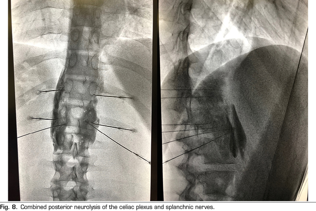 The splanchnic nerves are located in the anterolateral face of the vertebral bodies from T9 to T11, above the insertion of the diaphragmatic cruras, constituting an important barrier for situations that may increase the failure of a celiac plexus neurolysis (variables or anatomical changes, fibrosis, adhesions or tumor infiltration) (16). In these cases, splanchnic nerve neurolysis can be very useful, and it can be performed surgically or percutaneously.