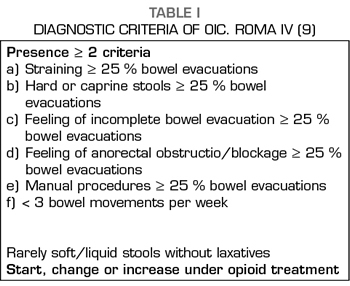Constipation is a multicausal symptom, in which pharmacological, metabolic or other causes contribute to its appearance; this has been especially evident in cancer patients (6). The role of opioid treatment has been recognized as one of the most important factors in the etiology of constipation in cancer patients, considered related in 84.5% of cases and with a moderate to intense intensity in 63% of them (7). The recognition of the relevance of the role of opioids has led to the recognition of opioid-induced constipation (OIC) as a specific entity in the new ROMA IV criteria (8,9), whose diagnostic criteria are shown in Table I.