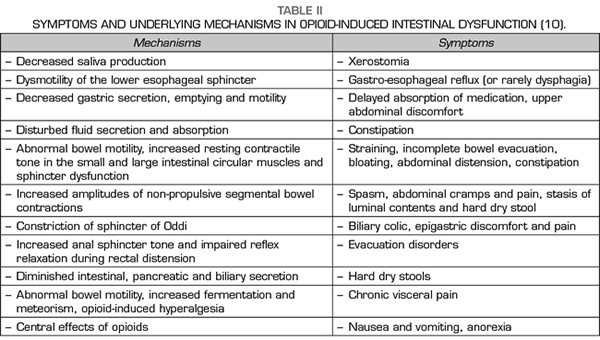 Constipation is perhaps the most obvious symptom of a whole set of changes produced by opioids on the digestive system, known as opioid-induced bowel dysfunction, characterized by slower GI passage, decreased secretion of intestinal fluids and increased sphincter tone (10-12) (Table II). The usual treatment of OIC is based on the use of laxatives, being the common and the most effective the combination of laxatives, often osmotic and stimulants being habitual and more effective (13,14), but their action is merely symptomatic and does not affect other symptoms and problems resulting from the action of opioids on the GI tract.