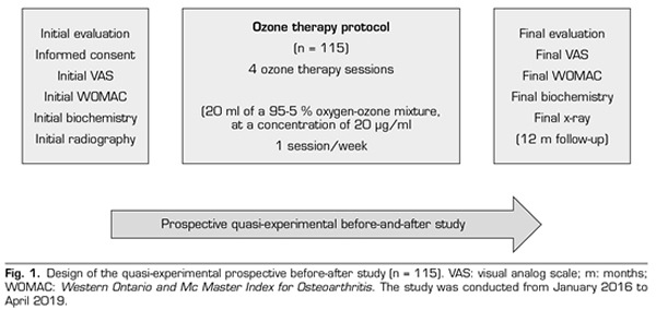 Material y métodos: Se realizó un estudio cuasiexperimental prospectivo tipo antes y después a 115 pacientes con artrosis de rodilla con Kellgren-Lawrence grado 2 o más. El protocolo de ozono consistió en 4 sesiones (una sesión/semana) de una infiltración intrarticular de 20 ml de una mezcla médica de oxígeno-ozono (95-5 %) a una concentración de 20 µg/ml. Las variables de resultado incluyeron variables clínicas (dolor, rigidez y función), bioquímicas (PCR, VSG, ácido úrico) y radiológicas (mínimo espacio articular femorotibial).