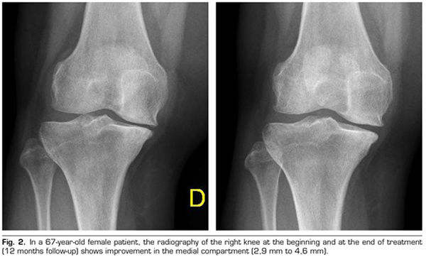 As far as we know, this is the first article that radiologically suggests the anabolic or structural effect of ozone on knee osteoarthritis, and therefore, modifier of the disease. There is only one study that has reported a disease modifying effect on osteoarthritis of the knee, through the oral use of glucosamine/chondroitin sulfate (3), although despite that study reported that such treatment only achieved anabolic effect on the lateral compartment and no anabolic effect was found in the medial compartment, it mainly refers to the natural evolution of the disease (osteoarthritis) than to a real modification produced by such drugs on knee osteoarthritis (4).
