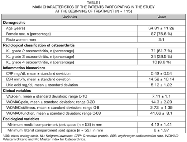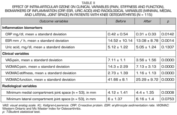 Methods: A prospective quasi-experimental before-and-after study was performed in 115 patients with knee osteoarthritis Kellgren-Lawrence grade 2 or more. The ozone protocol consisted of 4 sessions (one session / week) of an intra-articular injection of 20 ml of a medical mixture of Oxygen-Ozone (95-5ºC) at a concentration of 20 µg / ml. Outcome variables included clinical (pain, stiffness, and function), biochemical (CRP, ESR, uric acid), and radiological variables (minimal femorotibial joint space).