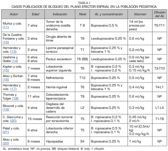 El bloqueo del ESP es una técnica recientemente descrita en pacientes adultos y para manejo de dolor neuropático, según mencionado por los autores (5). Actualmente el bloqueo ESP se viene realizando en la población pediátrica, con solo pocos informes (Tabla I), para manejo del dolor postoperatorio de cirugías torácicas (11,12,13,14,15, 20,21), nefrectomía (16), reparación de hernia inguinal (17), colecistectomía laparoscópica (18), displasia de cadera (19) e hipospadias (22). Hasta donde sabemos, el bloqueo ESP para dolor neuropático en niños aún no se ha reportado.