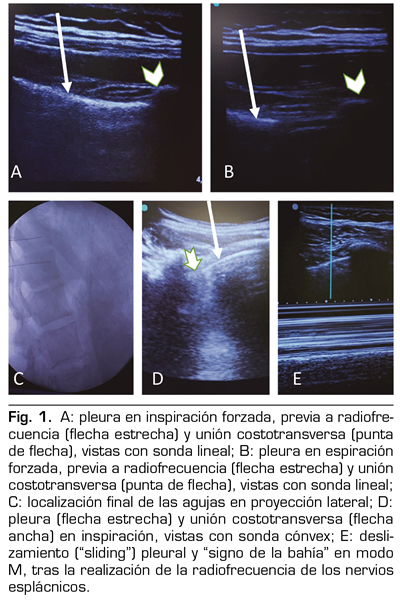 La radiofrecuencia de los nervios esplácnicos se indica principalmente para el tratamiento analgésico de los síndromes de dolor visceral abdominal y entre sus complicaciones más frecuentes está el neumotórax (1,2). Por ello, hasta ahora se recomienda el bloqueo unilateral y en un segundo tiempo el lado contralateral junto con la realización de una radiografía de tórax de control antes del alta del paciente. Sin embargo, la ecografía pulmonar podría ser una alternativa segura tanto para dirigir la punción como para descartar un neumotórax tras la realización de la técnica con una mayor sensibilidad y especificidad que la radiografía convencional.