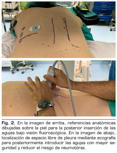 La radiofrecuencia de los nervios esplácnicos ha sido descrita para su realización con la ayuda de diferentes técnicas de imagen, entre ellas la tomografía computarizada, la resonancia magnética nuclear y la fluoroscopia (3). La ecografía pulmonar actúa de manera sinérgica y complementaria junto a la fluoroscopia para aumentar la seguridad del paciente. Previa introducción de las agujas bajo control fluoroscópico, la ecografía nos ayuda a localizar un espacio seguro (Figura 2) para evitar la punción pleural y así reducir el riesgo de neumotórax, y después confirmará su ausencia al finalizar el procedimiento.