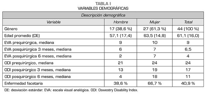 Se realizaron análisis de frecuencias para los datos sociodemográficos, encontrando que el 61,3 % fueron mujeres (n = 27). La edad promedio de cirugía fue 61,1 años (DE = 16 años) (Tabla 1). El diagnóstico más frecuente en los pacientes llevados a artrodesis lumbar fue la espondilolistesis (un 20,6 % listesis degenerativa y un 25 % lítica). El 88,5 % fue llevado a cirugía mínimamente invasiva siendo más frecuente los abordajes intersomáticos por vía anterior (un 34 % de los casos). El 40,9 % de los pacientes (n = 18) tenía en la última valoración clínica prequirúrgica signos de enfermedad facetaria.