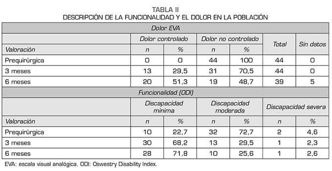En la evaluación prequirúrgica, los pacientes con “dolor no controlado” (EVA: 5-10) representaron el 100 % en la evaluación, disminuyendo a 70,5 % a los 3 meses y hasta 48,7 % en la evaluación semestral, es decir una disminución en 51,3 % al final del seguimiento (Tabla 2).