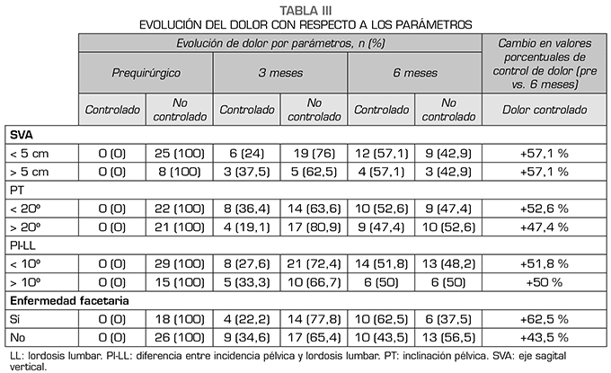 En cuanto al missmatch (PI-LL), se encontró un aumento similar en el control de dolor entre los 2 grupos (patológico vs. no patológico) quienes presentaron una reducción en puntos porcentuales del 51,8 % para aquellos con PI-LL < 10° y una reducción del 50 % en los que presentaron un PI-LL patológico (Tabla 3).