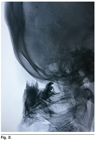 La técnica que se utilizó fue descrita por Racz y cols. (12), se localizaron mediante guía fluoroscópica a través de un arco C y en una posición anteroposterior las vértebras cervicales 1 y 2, posteriormente se rotó el equipo de arco en C a 90° para observar una proyección lateral, localizando las apófisis espinosas de las vértebras cervicales 1 y 2 (C-1 y C-2). Se eligió el punto de abordaje, localizado a 2 centímetros lateral izquierda de la protuberancia occipital mayor en la línea nucal superior, se infiltró piel cabelluda y tejido celular subcutáneo con lidocaína simple al 2 %. Posteriormente se introdujo una aguja espinal BD tipo Quincke 22 G 88 mm, en sentido cefalocaudal y lateromedial; de manera cuidadosa se avanzó a través de las capas fasciales musculares para evitar una lesión nerviosa o vascular (entre las que se encuentran la raíz nerviosa de C-1 o nervio suboccipital, raíz nerviosa de C-2 o tercer nervio occipital, el plexo cervical, la arteria cervical ascedente, la arteria o vena cervical profunda, y la arteria o vena vertebral) hasta hacer contacto con apófisis espinosa de C-2 (Figura 1); se retiró 2 mm y se aspiró para verificar punción inadvertida de vasos o duramadre. Una vez confirmado que no hubo salida de sangre o líquido cefalorraquídeo, se administraron 4 ml de medio de contraste no iónico, observando una difusión hacia la región occipital de forma triangular (triángulo formado por los músculos oblicuo mayor, oblicuo menor, recto posterior de la cabeza y el semiespinoso de la cabeza) (Figura 2). Ya corroborado el objetivo terapéutico, se aspiró nuevamente y se administraron 5 ml de bupivacaína (25 mg) con metilprednisolona no soluble (40 mg) aforados en solución salina hasta un total de volumen de 10 ml en el lado afectado, observando una adecuada disección de los planos musculares antes descritos en la imagen fluoroscópica. Se retiró aguja, se pasó a la paciente a recuperación sin incidentes, ni complicaciones.