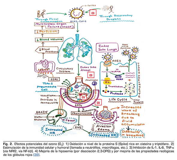 El ozono tiene demostradas cuatro propiedades biológicas que podrían permitir su uso como terapia complementaria en las diferentes fases de la infección por SARS-CoV-2. El ozono podría inactivar el virus teóricamente por oxidación indirecta (ROS y LOP) y podría estimular el sistema inmune celular y humoral, siendo útil en la fase de infección temprana (estadios 1 y 2a). El ozono mejora el intercambio gaseoso, reduce la inflamación y modula el sistema antioxidante, por lo que sería útil en la fase de hiperinflamación o “tormenta de citocinas”, y en la fase de hipoxemia y/o fallo multiorgánico (estadios 2b y estadio 3).