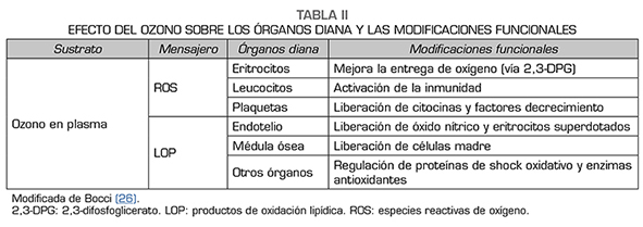 El ozono es un agente capaz de modular eficazmente el estrés oxidativo, estabilizando el equilibrio prooxidante y antioxidante y también la inflamación (31). En resumen, el ozono podría aumentar las propiedades reológicas de la sangre y podría mejorar la entrega de oxígeno, la producción endotelial de óxido nítrico y la modulación de la inmunidad vía inducción de citocinas. En este sentido, el ozono es el inductor de citocinas “ideal” (Tabla 2) (26,32).