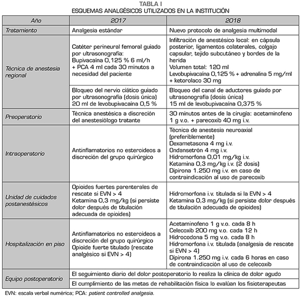 Durante el año 2018 se implementó un protocolo de analgesia multimodal para la evaluación prospectiva de su impacto en el manejo del dolor postoperatorio en pacientes con RTPR que incluyó el uso de bloqueo de canal de aductores dosis única asociado a infiltración de anestésico local periarticular intraoperatoria (grupo IAL + BCA) más un esquema de analgesia multimodal estandarizado durante la fase pre, intra, y postoperatoria, detallado en la Tabla 1.