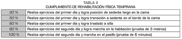 Por otro lado, las metas de rehabilitación temprana para pacientes sometidos a RTPR se encuentran descritas en la guía institucional, realizada por el servicio de fisiatría y fisioterapia. Para la valoración del cumplimiento de metas se definieron ejercicios para el primer y el segundo día postoperatorio. Los ejercicios del primer día se realizaron en cama con la ayuda del acompañante si el paciente así lo requería, e incluyeron movilización de los tobillos, flexionar la rodilla según tolerancia de dolor, elevación del miembro inferior operado, separación de los miembros inferiores y contracción activa de cuádriceps y glúteos. Los ejercicios del segundo día se realizaron de pie con ayuda de un caminador y bajo supervisión, e incluyeron abducción y extensión activa del miembro inferior operado. El objetivo final de la terapia física fue lograr la deambulación asistida con caminador por el pasillo. El grado de cumplimiento se valoró en un porcentaje del 0 % al 100 % (Tabla 2) según las metas alcanzadas.