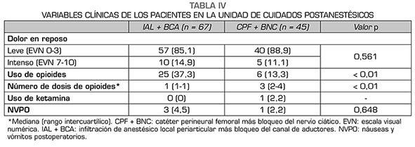 Resultados: Se analizaron 112 pacientes (67 en IAL + BCA y 45 en CPF + BNC). Ambas poblaciones fueron comparables en variables demográficas. La mediana del dolor en reposo en el primer y segundo día postoperatorios fue EVN 2/10 para ambos grupos. El promedio del dolor en movimiento en el segundo día postoperatorio fue EVN 5/10 para los pacientes con IAL + BCA y 4/10 para los pacientes con CPF + BNC, p = 0,073. El porcentaje de pacientes que cumplieron el 80 % o más de las metas de rehabilitación fue similar en ambos grupos (p = 0,201).