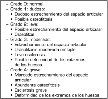 Para la evaluación de pruebas de imagen se utiliza la clasificación radiológica de Kellgren y Lawrence, que va desde el grado 0 donde no existen signos de artrosis hasta el IV donde la afectación es grave (Tabla I).