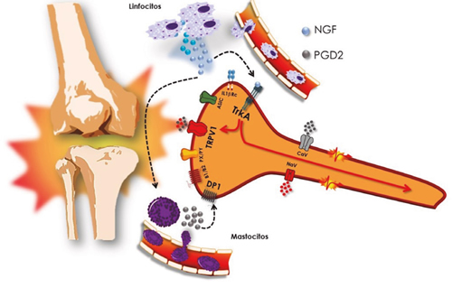 Pero además de este mecanismo, la implicación de NGF en el dolor artrósico se debe a su participación en otros procesos. Por ejemplo, en las articulaciones de ratas con artrosis, el NGF extracelular actúa a través de la activación del receptor TrkA en los mastocitos, lo que provoca un aumento en la activación de COX-2 y, con ello, la síntesis de PGD2. La unión de esta prostaglandina a su receptor específico puede sensibilizar a las neuronas sensoriales mediante la activación de los receptores selectivos DP1 (39), lo que facilita el envío de información nociceptiva desde la rodilla hasta el asta dorsal de la médula espinal (40) (Figura 3).