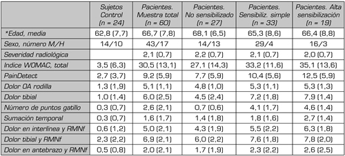 Del total de pacientes artrósicos 19 cumplían todos los criterios de Arendt-Nielsen, mientras que 14 pacientes mostraban solo algún criterio de SC. A nivel clínico lo más destacable fue la magnitud del fenómeno, ya que, en función de los resultados el 32 % de los pacientes estaban totalmente sensibilizados y el 55 % de los pacientes presentaban algún grado de SC (Tabla I).