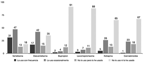 Antidepresivos (AD) y antipsicóticos: la VLF (28,5 % con frecuencia y 43,1 % ocasionalmente) y la DVF (15,6 % con frecuencia y 38,5 % ocasionalmente) son los AD que más frecuentemente se prescriben para dolor fuera de indicación. Un 4,5 % de los encuestados usan la QTP de manera frecuente y un 24 % ocasionalmente (Figura 4). La mayoría de los encuestados que utilizan AD o antipsicóticos fuera de indicación refieren hacerlo basado en resultados de publicaciones (53,15 %), seguido de información obtenida en cursos y congresos (21,17 %) (Tabla III).