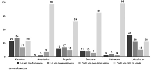 Fig. 5. Frecuencia de uso de anestésicos y otros. Se representan las frecuencias de uso en números absolutos. Se incluye la lidocaína endovenosa, a pesar de estar en otra å del cuestionario, para facilitar la comprensión de los resultados