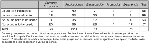 En cada uno de ellos se preguntó por la frecuencia de uso mediante una escala de Likert de 4 opciones (“usado con frecuencia”, “ocasionalmente”, “no lo uso pero lo he usado” y “no lo uso ni lo he usado”) y por el razonamiento científico seguido para su prescripción con otra escala de 5 opciones (“información de cursos y congresos”, “protocolos de mi centro”, “publicaciones”, “experiencia propia”, y “extrapolación de artículos de básica o mecanismos de acción”). Esta última pregunta era de respuesta múltiple (se podían marcar varias respuestas).