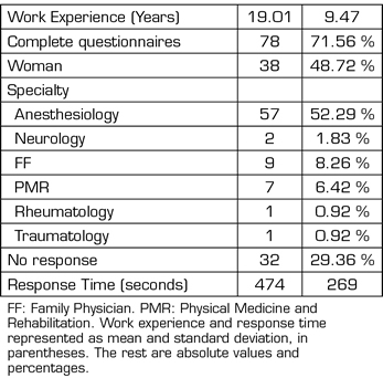 A total of 150 out of the 1356 members who had registered in the SED responded to the survey in the 4 weeks available to answer. After the incomplete responses of less than 100 seconds were deleted, 110 surveys remained, from which a single duplicate record was deleted. The target population was only those active physicians, who were 1085 out of 1285. Thus, the response rate was 13.82 %, being 10.05 % after the invalid ones were ruled out.
