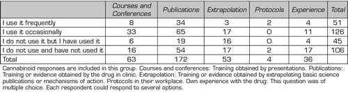 Each asked about the frequency of use using a Likert scale of 4 options (“used frequently”, “occasionally”, “I do not use but I have used it”, and “I do not use and I have not used it”) and for the scientific reasoning followed for its prescription with another scale of 5 options (“information from courses and conferences”, “protocols of my workplace”, “publications”, “own experience”, and “extrapolation of basic articles or mechanisms of action”). This last question was multiple-choice (multiple answers could be marked).