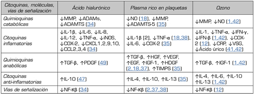 Recientemente, Fernández-Cuadros y cols. reportaron las propiedades inmunomoduladoras y anabólicas del ozono (O2-O3) mediante la regulación positiva de citoquinas antiinflamatorias (IL-4, IL-10), factores de crecimiento (TGF-β, IGF-1), células madre y la regulación inhibitoria de citoquinas inflamatorias y catabólicas (MMPS, NO [óxido nítrico], PgE2 [prostaglandina E2]) (1,40) (Tabla I).