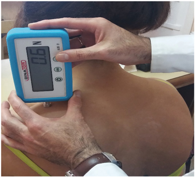 La medida de la AP se realizó con un algómetro de presión (marca Dinator®, Industria Argentina), aparato que mide la fuerza necesaria para provocar sensaciones dolorosas en puntos seleccionados del cuerpo previamente estandarizados en estudios sobre TSC (1). Es un dispositivo medidor que presenta en un extremo un instrumento metálico de 1 cm de diámetro que se aplica sobre la piel a velocidad constante, provocando sobre la misma un incremento de fuerza y, por ende, sensaciones de tacto, presión y finalmente dolor, según la fuerza aplicada (1). Dicho dispositivo se ubica perpendicularmente sobre la piel del paciente a una presión constante hasta que la sensación se vuelve molesta, momento en que el paciente avisa y se interrumpe la aplicación de la fuerza (Figura 1) (1). El valor registrado consiste en el UDP expresado en Newtons (N).