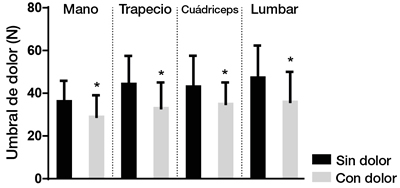 Results: In the group with pain, the pressure pain threshold value was lower than in the group without pain in all the points evaluated. The pain threshold va­lue at the mean pressure of the four regions analyzed in the group with pain, turned out to be lower than in the group without pain, 32.7 ± 10 Newtons versus 42 ± 11.7 Newtons (p = 0.004). The mean pressu­re pain threshold was lower in female patients than in male patients, 36.6 ± 9 Newtons versus 48 ± 11 Newtons (p = 0.001). In the 20 healthy volunteers who underwent the conditioned modulation of pain test at the trapezius level, the pain threshold at the initial pressu­re was 63 ± 27 Newtons and the final pressure was 72 ± 28 Newtons, with an average increase of 9 Newtons (14.2 %). In the 16 in which the temporal summa­tion test was carried out, it was found that the pain level of the numerical visual scale went from 4.1 ± 1.0 to 6.5 ± 1.5 between the first and tenth stimulus.