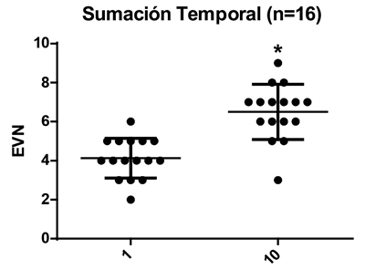 En los voluntarios en los que se realizó la prueba de ST, se encontró que el nivel de dolor pasó de EVN de 4,1 ± 1 con el estímulo inicial a 6,5 ± 1,5 con el estímulo final, lo que implica 2,4 puntos de aumento (58 %), diferencia estadísticamente significativa aplicando un test de T para muestras dependientes (p = 0,0001) (Figura 4). El Wind-Up ratio (WUR) calculado (correlato porcentual de la ST) resultó en un valor de 1,58.