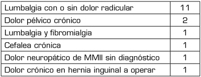 De los 58 pacientes, 18 (31 %) respondieron presentar algún tipo de dolor crónico previo a la cirugía en distintas topografías o en el sitio quirúrgico (grupo con dolor). Las causas de dolor encontradas en este grupo se exponen en la Tabla I.
