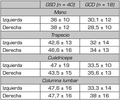 La Tabla II muestra los promedios de los UDP en mano, trapecio, cuádriceps y lumbar, derechos e izquierdos, tanto en el grupo con dolor como en el grupo sin dolor.
