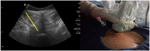 Fig. 1. Escaneo ecográfico en eje corto o transversal del espacio L5-S1. La flecha amarilla muestra el punto de entrada de la aguja de Touhy en el abordaje paramedial y su trayecto. A la derecha se muestra la colocación de la aguja Sono Touhy en plano con el transductor curvo.