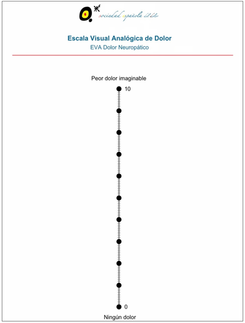 En primer lugar, se utilizó la escala visual analógica del dolor (EVA) (Anexo I), que consiste en una línea horizontal de 10 centímetros en la que el paciente debe marcar el lugar que considera que se encuentra su dolor. En el lado izquierdo se encuentra la ausencia o menor intensidad de dolor, y en el derecho la mayor intensidad. La intensidad se mide en centímetros o milímetros siendo leve hasta 4 cm, moderada de 5-7 cm y severa si es mayor de 7 cm (13).