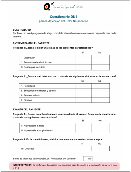 En segundo lugar, se ha utilizado el cuestionario Douleur Neuropathique-4 ítems (DN4), (Anexo II), compuesto por 10 ítems, que consiste en descripciones y signos de dolor que se evalúan con 1 (sí) o 0 (no) para identificar a pacientes que tienen una gran probabilidad de tener componente de dolor neuropático. Las puntuaciones de los ítems individuales se suman para obtener una puntuación total máxima de 10, con un punto de corte ≥ 4 (14).