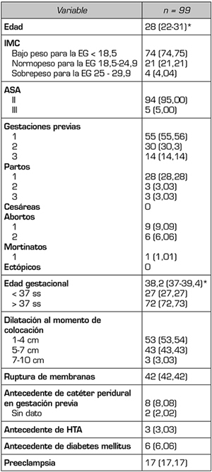 La Tabla 1 describe las características generales de la población. La mediana de edad de fue de 28 años (22-31), el 72 % de las pacientes cursaba con embarazo a término y el 94 % fueron catalogadas como ASA (Sociedad Americana de Anestesiología, por sus siglas en inglés) II. El catéter peridural se insertó en la fase latente del trabajo de parto en el 53,4 % de los casos y el 57 % tenían membranas íntegras al momento de la colocación. Solamente un 8,08 % de las pacientes había usado previamente un catéter peridural durante el trabajo de parto anterior y ninguna de las pacientes presentaba antecedente de enfermedad renal crónica, lumbalgia o consumo crónico de opioides.